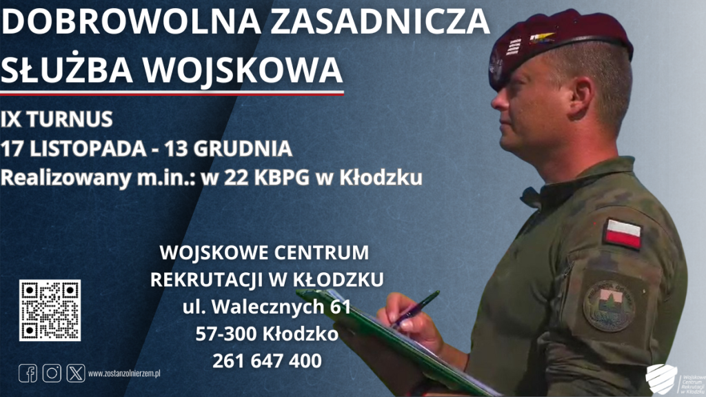 Wraz z Wojskowym Centrum Rekrutacji w Kłodzku zachęcamy wszystkich chętnych do wzięcia udziału w ostatnim w tym roku szkoleniu w ramach Dobrowolnej Zasadniczej Służby Wojskowej!