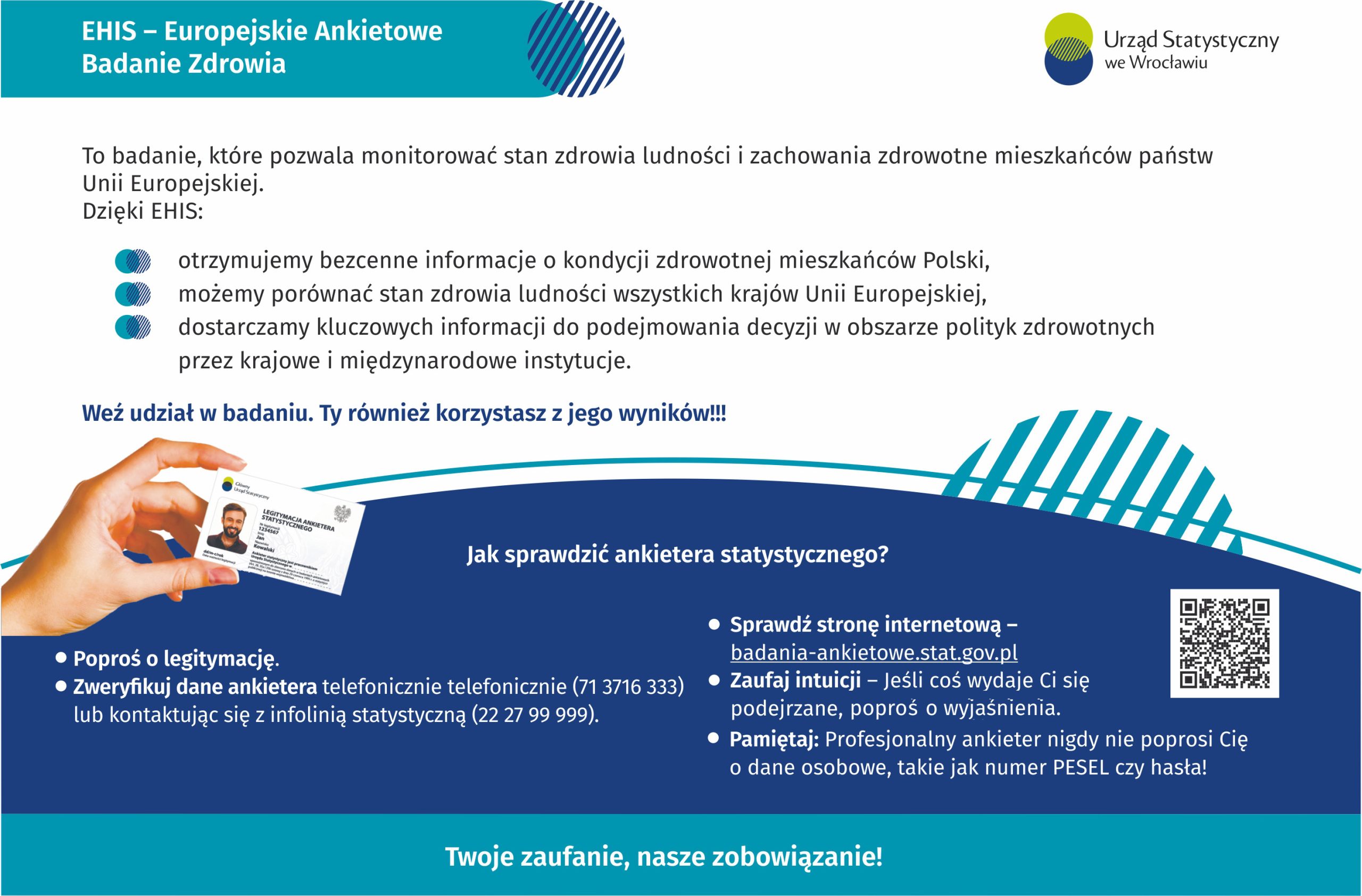Informujemy, że na terenie naszej Gminy prowadzone jest w terminie 1.09. – 31.12.1015 r. Europejskie Ankietowe Badanie Zdrowia (EHIS). Jest ono prowadzone co 6 lat we wszystkich krajach Unii Europejskiej, po to, aby można było porównywać wyniki o stanie zdrowia mieszkańców poszczególnych państw.