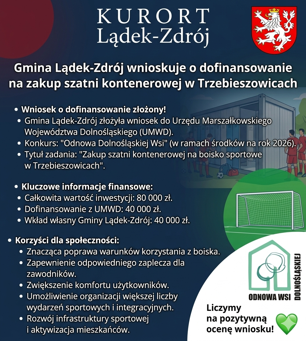 Gmina Lądek-Zdrój złożyła wniosek do Urzędu Marszałkowskiego Województwa Dolnośląskiego w ramach konkursu „Odnowa Dolnośląskiej Wsi” w 2026 r. na realizację zadania pn. „Zakup szatni kontenerowej na boisko sportowe w Trzebieszowicach”.