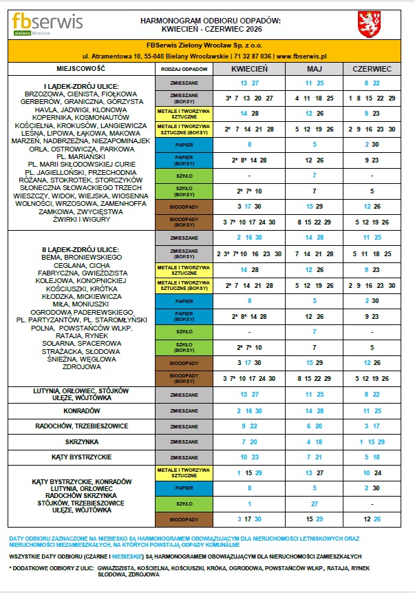 Oznacza to, że od dnia 1 kwietnia 2026 r. Gmina Lądek-Zdrój odbierać będzie odpady komunalne od właścicieli nieruchomości, na których nie zamieszkują mieszkańcy, a powstają odpady komunalne.